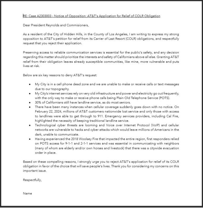As a resident of Hidden Hills, you know how critical landline service is. Given our frequent internet and electrical outages, poor-to-non-existent cellular phone service, and constant threat of natural disasters, losing the reliability of landline service is potentially catastrophic. We do not have to look further than Woolsey Fire to know how necessary landline service was to our community’s survival.