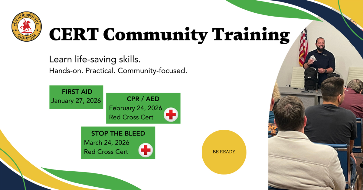This hands-on training is open to all residents — CERT and non-CERT alike — and is proudly hosted by the City of Hidden Hills. January’s session kicks off a three-part safety training series, which will also include AED, Stop the Bleed, and CPR certification in the months ahead.
