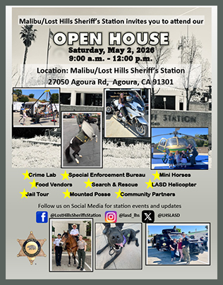 The annual Malibu/Lost Hills Sheriff’s Station Open House will take place on Saturday, May 2, and you’re invited. This fun, family-friendly event features a variety of activities and offers a great opportunity to meet the deputies who serve and protect our community.