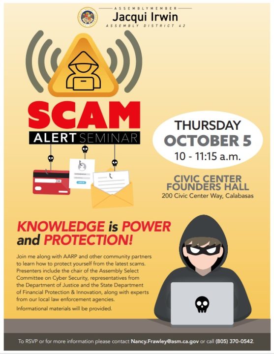 Each year tens of billions of dollars are stolen from well-meaning people because of targeted scams. Assemblymember Jacqui Irwin has scheduled a series of “Scam Alert Seminars” to be held in various communities throughout the 42nd Assembly District to educate her constituents on the tools and resources needed to recognize and combat these deceitful and dishonest practices. These seminars, co-hosted by the American Association of Retired Persons (AARP), the City of Calabasas, California Department of Justice (DOJ), California Department of Financial Protection & Innovation, and the Los Angeles County Sheriff’s Department will provide residents with information on how to protect themselves from the latest scams.