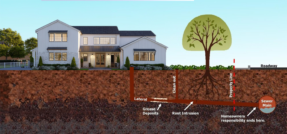 Homeowners are required to maintain the lateral from their home to the main sewer line, typically located in the street or nearby easement. Maintaining the lateral includes keeping the lateral line flowing and free of debris such as roots, or grease.